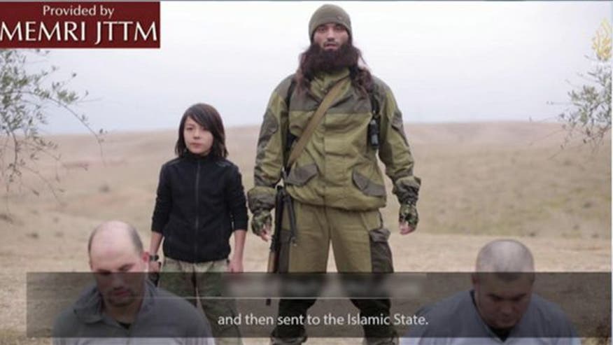 A horrifying new video released online on Tuesday appears to show ISIS using a young boy to execute a pair of captives the terror group claims are Russian spies.